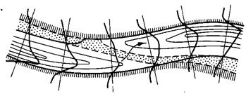 Глубокие участки русла реки соответствуют изогнутым в плане частям русла, а перекаты — прямолинейным участкам, расположенным между закруглениями.