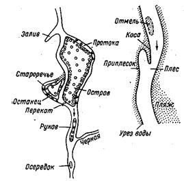 побочень – песчаное скопление в виде примыкающей к берегу части перекошенной в плане ленточной гряды;