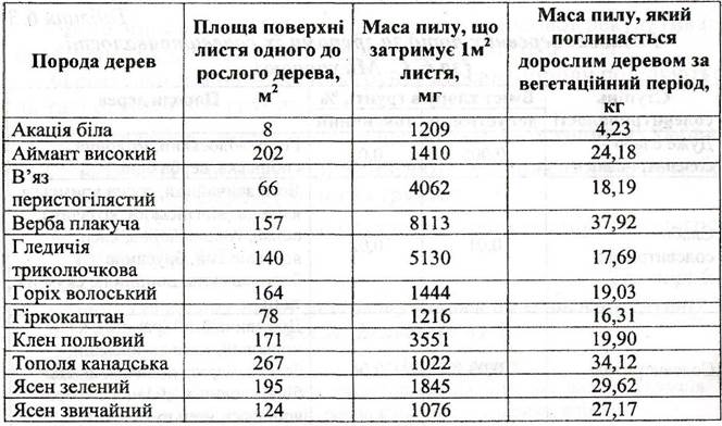 У випадку проведення лісової рекультивації треба передбачити її екологічну роль. Адже дерева мають здатність протистояти отруйним забрудненням атмосфери і збільшувати її киснем. Так підраховано, що щорічні лісові насадження планети поглинають понад 850 млн. т вуглецю, понад 100 млн. т водню і майже З млн. т азоту. При цьому в повітря надходить близько 2,5 млрд. т кисню. Доведено, що чотири дорослих дерева поглинають за вегетаційний період 1,5 кг вуглекислого газу і віддають атмосфері 1,1кг кисню. Цієї кількості кисню достатньо для дихання чистим повітрям однієї людини протягом доби. Загалом 1га лісу здатний очистити за вегетаційний період 18 млн.м3 повітря. Ялинові ліси можуть затримати кронами до 32 т/га пилу, соснові - 36, діброви - 54, бучини - до 68 т/га. Це свідчить про те, що різним деревним породам властива різна потенційна можливість акумулювати і нейтралізувати пил атмосфери (див. табл. 6.4).