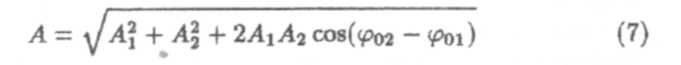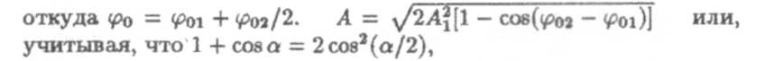 Необходимо определить амплитуду А результирующего колебания и начальную фазу φ0. Применяя формулу преобразования синуса суммы и подставляя в (3) выражения (4), (1), (2), получим