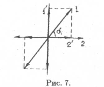Если гармонические колебания совершаются под углом а (а ≠π/2), то проведя две взаимно перпендикулярные оси, одна из которых совпадает с гармоническим колебанием 2 (рис. 7), разложим затем гармоническое колебание 1 на два составляющих 1' и 2' по этим осям.