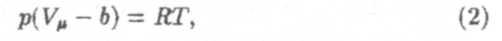 Молекулы в сосуде движутся менее свободно, чем если бы они были точечными. Объем, предоставленный для свободного движения молекул меньше геометрического объема сосуда на некоторую величину 6, связанную с собственным объемом молекул и постоянную для данного количества газа. Поэтому объем Vp в уравнении (1) должен быть заменен на Vμ — b:
