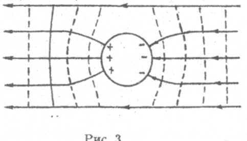 На рисунке 3 показано частичное обтекание внешним однородным электрическим полем незаряженного металлического шара. На рисунке 3 показаны силовые линии поля (сплошные линии), эквипотенциальные поверхности (пунктирные линии) и заряд, индуцированный на поверхности шара.