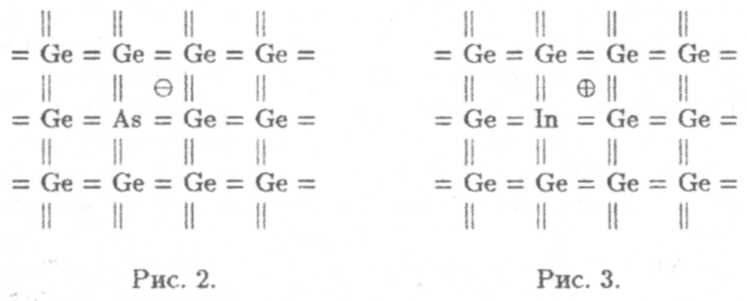 б) Пусть теперь в 4-валентный германий добавлена примесь из III группы таблицы Менделеева, например, индий. Уиндия три валентных электрона, которые свяжутся с тремя соседними атомами германия, образуя прочные связи (рис. 3). Связь с четвертым атомом германия будет непрочной, т.к. нет четвертого внешнего электрона. Поэтому каждый атом индия образует по одной дополнительной дырке, которая может хаотически перемещаться по кристаллу. В результате количество дырок стало много больше количества электронов (пр > пе). Дырки становятся основными носителями тока, а электроны — неосновными. Такой полупроводник называется полупроводником р-типа. Примесь, обогащающая полупроводник дырками, называется "акцепторной*.