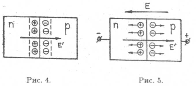 Выясним теперь, как проходит ток через кристалл с р-п переходом. Включим его так, чтобы к р-полупроводнику был присоединен положительный полюс источника постоянного тока, а к п -полупроводнику — отрицательный полюс (рис. 5). При этом внешнее поле Епротивоположно полю запирающего слоя Е'.
