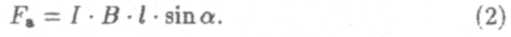 На проводник с током, помещенный в магнитное поле, действует сила Ампера Fa,прямо пропорциональная силе тока в проводнике I, длине проводника l, индукции магнитного поля Ви синусу угла а между направлением вектора индукции Ви тока в проводнике