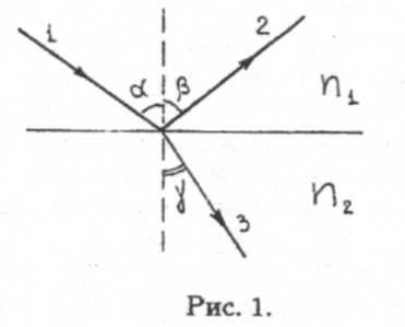 Если свет падает на плоскую границу, раздела двух однородных сред, то падающий луч 1 разделяется на отраженный луч 2 и преломленный луч 3 (рис. 1). Углы, которые лучи 1, 2, 3 образуют с нормалью к границе раздела, называются соответственно углами падения а, отражения β и преломления ζ.