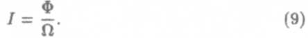 Сила света I измеряется отношением светового потока Ф, создаваемого точечным источником света в телесном угле, к этому телесному углу Ω: