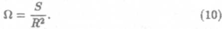 Телесный угол — это часть пространства, ограниченная конической поверхностью. Телесный угол определяется отношением площади S, вырезаемой этим углом на поверхности сферы с центром в вершине телесного угла, к квадрату радиуса сферы (рис. 5)