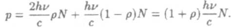 Рассчитаем световое давление, которое оказывает монохроматический пучок света частотой v при нормальном падении на поверхность, имеющую коэффициент отражения ρ. Если за 1 с на 1 м2 поверхности падает N фотонов, то от поверхности отразится N фотонов, а (1 - ρ)N — поглотится. Каждый поглощенный фотон передает поверхности импульс hv/c, а каждый отраженный — 2hv/c. Давление ρ света равно импульсу, переданному поверхности за 1 с N фотонами