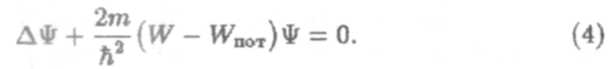 Здесь W — полная энергия частицы. Подставив (3а) в общее уравнение Шредингера и сократив на соответствующий экспоненциальный множитель, после небольших преобразований получим стационарное уравнение Шредингера:
