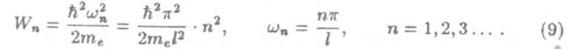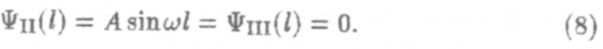 Так как А ≠ 0, то sinωl = 0. Это возможно только в том случае, когда ωl =nπ, п — целое, отсюда следует квантование величины ω, а значит, и квантование энергии