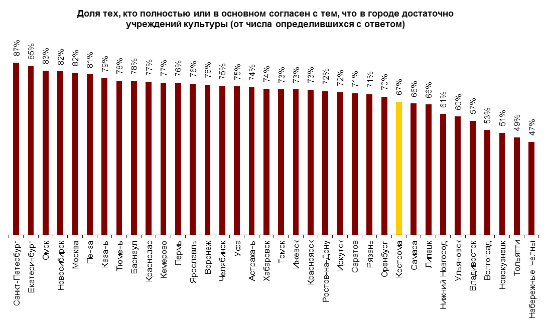 | С тем, что в их городе достаточно учреждений культуры (театры, кинотеатры, галереи, библиотеки), полностью или в основном согласны 76% жителей российских городов. Самые культурно «оснащенные» города из рассмотренных в исследовании – это Санкт-Петербург, Екатеринбург и Омск, отстающие по этому показателю – Новокузнецк, Тольятти и Набережные Челны. |