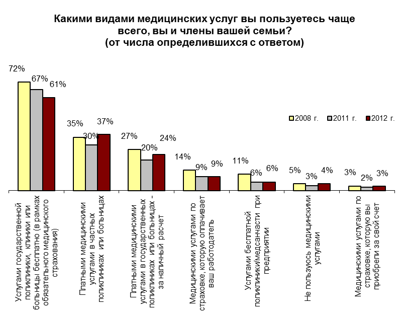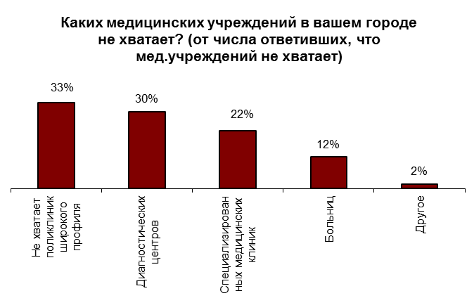 | Сегодня 34% жителей крупных и средних городов полностью или в основном довольны работой системы здравоохранения в своем городе, против 43% в прошлом году. Среди рассмотренных городов наибольший уровень удовлетворенности работой здравоохранения отмечен в Тюмени, Томске и Барнауле, наименьший – в Санкт-Петербурге, Волгограде и Воронеже. |