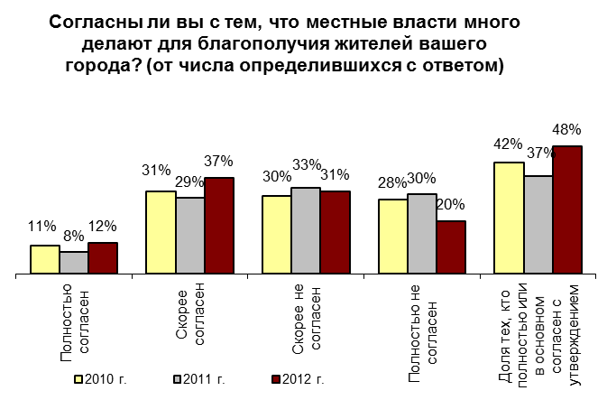 | По состоянию на 2012 год 79% жителей российских городов полностью или в основном довольны качеством городской среды – они считают свой город вполне удобным для жизни. Самыми удобными для жизни из рассмотренных нами городов являются Тюмень, Пенза и Набережные Челны, наименее удобными – Владивосток, Москва и Новокузнецк. |