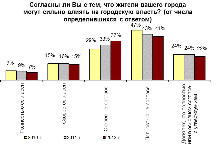 | Доля полностью или в основном согласных с тем, что жители вашего города могут сильно влиять на городскую власть | |||