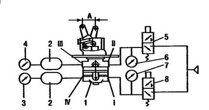 Рис.7 Схема підключення гальмівного крана для випробувань на стенді: І,ІІ,ІІІ,ІV- виводди гальмівного крана; 1-гальмівний кран; 2-повітряний балон; 3,4,6,7- манометри; 5,8- крани.