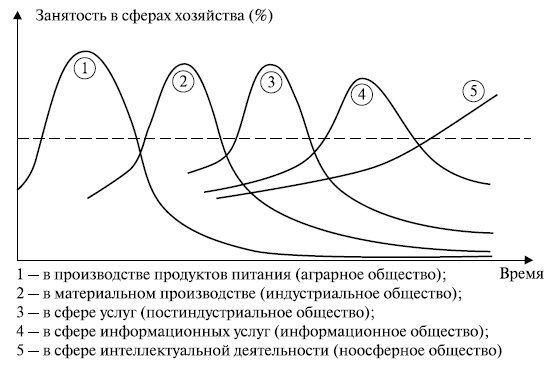 Наиболее краткое определение, характеризующее барьер перехода к информационному обществу, сформулировано аналогично определению постиндустриального общества, в котором слово "услуги" заменено на "информационно-интеллектуальные услуги" и звучит так: Если в обществе более 50% населения занято в сфере информационно-интеллектуальных услуг, общество становится информационным. Этот социально-экономический аспект занятости населения иллюстрируют наблюдения, предложенные Порэтом в виде диаграммы, которая представлена на рис. 5.1. Уровень занятости 50% проходится дважды: первый раз при становлении новой общественной формации, второй - когда следующая волна развития покрывает общественные потребности, сформулированные на предыдущих этапах, меньшим количеством работников.