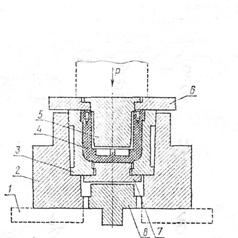 1 — станина пресса; 2 — корпус пресс-фермы; 3 — блок матриц; 4 — корпус гидронасоса; 5—внутренний пуансон; 6 — верхняя плита; 7 — шайба; 8 — выталкиватель.
