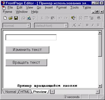 Поместим на страницу встроенные элементы (две командные кнопки и текстовое окно) и элемент ActiveX – Метку (рисунок. Эта метка может вращаться при изменении угла поворота (свойство – Angle).