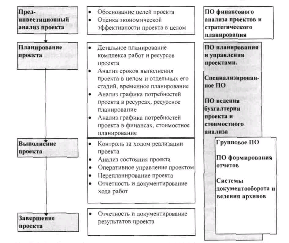 На рисунке 1. показан обобщенный жизненный цикл проекта и управленческие функции, связанные с различными стадиями проекта. Для поддержки различных управленческих функций используется разное информационное и программное обеспечение.
