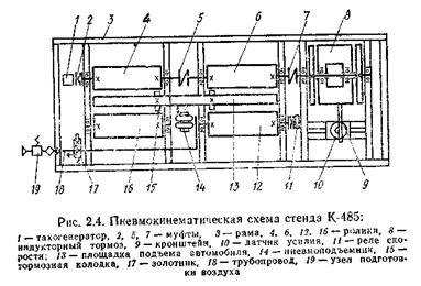 Из пневмокинематической схемы стенда К-485 видно, что опорное и нагрузочное устройства (рис. 2.4) размещены на общей раме 3. Передние (рабочие) ролики 4, 6 здесь соединены между