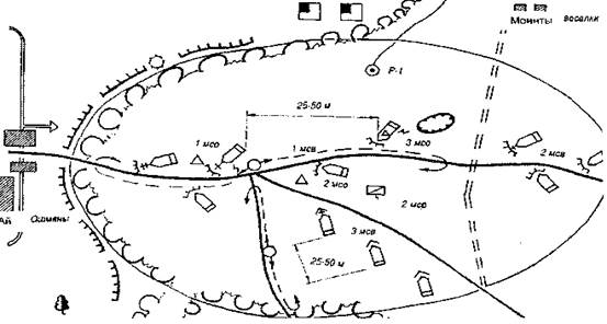 В батальоне организуется сторожевое охранение сторожевыми постами в составе отделения, танка (удаление до 1500 м) и секретами в составе двух-трех человек (удаление до 400 м).