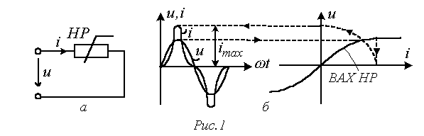 В качестве примера на рис. 1,а представлена цепь с нелинейным резистором (НР), нелинейная вольт-амперная характеристика (ВАХ) которого обусловливает несинусоидальную форму тока i в цепи при синусоидальном напряжении u на ее входе (см. рис. 1,б).