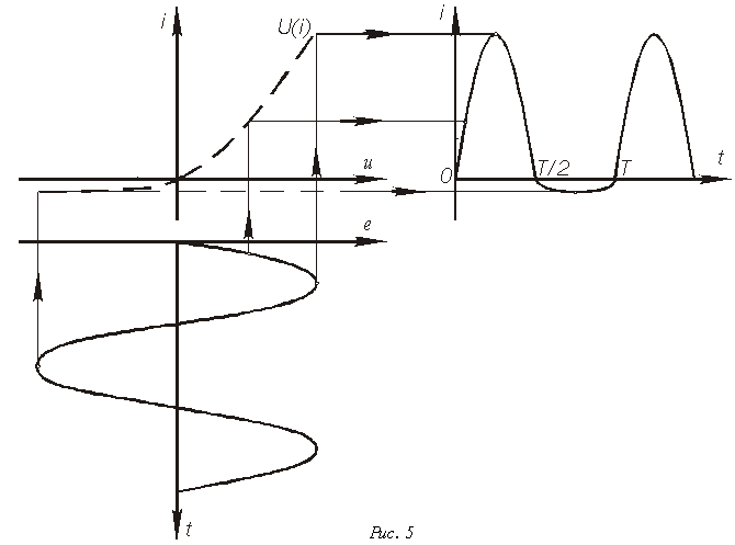 К полученному результату необходимо сделать следующий комментарий. Использование при анализе подобных цепей ВАХ идеального вентиля (обратный ток отсутствует, в проводящем направлении падение напряжения на диоде равно нулю) корректно при достаточно больших значениях амплитуд приложенного к диоду напряжения, определяющих значительное превышение током, протекающим через вентиль в прямом направлении, его обратного тока, вследствие чего последним можно пренебречь. При снижении величин напряжения, когда эти токи становятся сопоставимыми по величине, следует использовать ВАХ реального диода,представленную на рис. 4 и учитывающую наличие обратного тока.