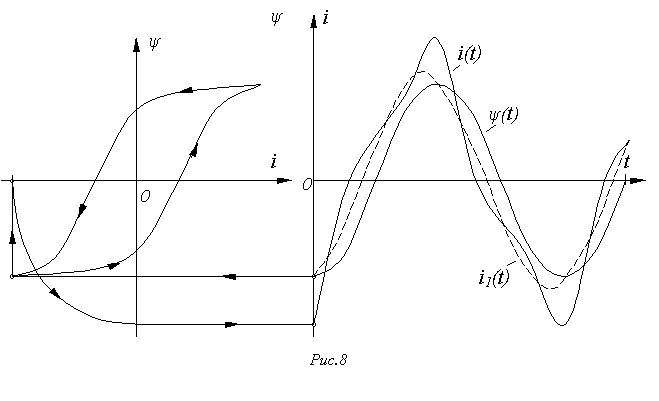 на рис. 8) опережает по фазе потокосцепление и, следовательно, отстает по фазе от синусоидального напряжения на катушке на угол, меньший 90°. Это указывает (