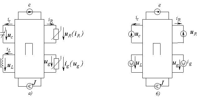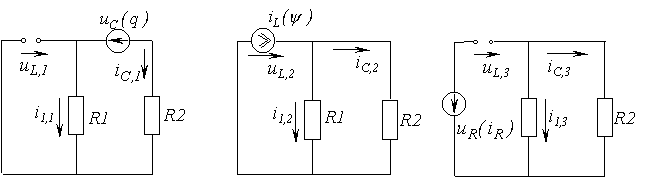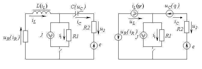 - первая включает в себя элементы, запасающие энергию, а также нелинейные резистивные элементы и источники питания;
