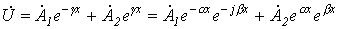 Слагаемые в правой части соотношения (7) можно трактовать как бегущие волны: первая движется и затухает в направлении возрастания х, вторая – убывания. Действительно, в фиксированный момент времени каждое из слагаемых представляет собой затухающую (вследствие потерь энергии) гармоническую функцию координаты х, а в фиксированной точке – синусоидальную функцию времени.