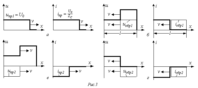 В результате (см. рис. 3,б) напряжение в линии, куда дошел фронт волны, удваивается, а ток спадает до нуля.