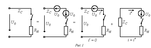 С учетом граничных условий расчет переходных процессов в цепях с распределенными параметрами можно проводить как при нулевых, так и ненулевых начальных условиях. Однако в первом случае анализ осуществляется в целом проще, что определяет целесообразность сведения расчета к нулевым начальным условиям. Пример такого сведения на основе принципа наложения для задачи на подключение в конце линии нагрузки схематично иллюстрирует рис. 1, где в последней схеме сопротивление