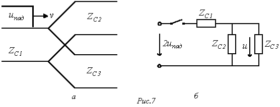 , то в соответствии со схемой замещения на рис. 7,б напряжение на стыке линий в момент прихода волны