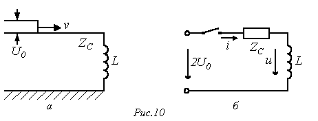 на включенный в конце линии индуктивный элемент (см. рис. 10,а). В соответствии с расчетной схемой на рис. 10,б для тока через катушку индуктивности и напряжения на ней соответственно можно записать