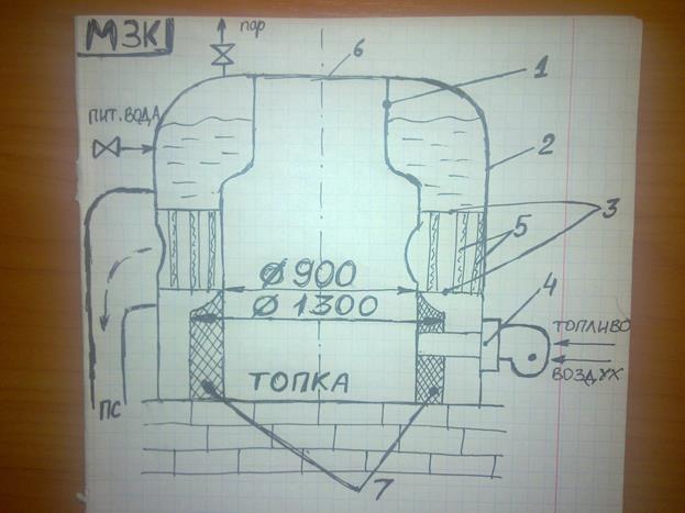 1- внутренняя концентрическая обечайка; 2- корпус котла; 3- верх и нижн горизонтальные трубные решетки; 4 – горелка; 5 – вертикальные трубы конвективного пучка; 6 - взрывная мембрана; 7- огнеупорная футеровка. Корпус котла сост из двух концентрич(цилиндрич) пов-тей, вставл одна в другую. Внутр пространство концентрич обечайки 1 представл собой топочную камеру и вертик газоход. Для защиты металла обечайки в нижн ее части устан огнеупорная футеровка. Пространство между обечайкой и корпусом заполнено водой. Такде в этом пространстве установл 2 горизонт перегородеи, в кот вварены 3 ряда верт труб, диаметром 51 мм. В междутрубном пространстве нах-ся продукты сгорания, выход через боковое окно из топки и покидающие котел с противоложн стороны через газоход. В верт трубах образ пароводян смесь, кот под ним в верх часть котла и раздел на пар и воду. Образовавш пар скапливается в паровом к потребителю. В верх части концентрич обечайки устан взрывн мембрана, кот предотвращ разрушение котла в случае хлопка в топочн пространтсве. В качестве топлива котел может использ газ или мазут и, в зависимости от вида топлива КПД сост 85-88%
