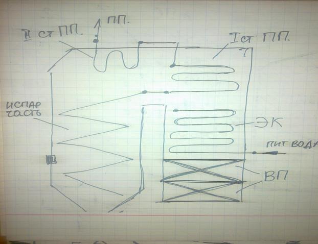 Особенностью прямоточных котлов яв-ся наличие доп конв испарит поверхности, располож между пов-тями, наход в топке, и пов-тями ПП. Конв пов-сть наход в гориз или опускн газоходе и служит для сепарации пара перед подачей его в пароперегреватель. Сост из верт гладкотрубных пакетов. В верт трубах пар подним вверх, а ост жидкость по стенкам стекает в ниж часть пакета. Такая система предотвращ подачу влаж пара в пов-м ПП. Прямоточными вып. толкьо энергетич парогенераторы с давл выраб пара близким к критич. КПД сост 93-95%