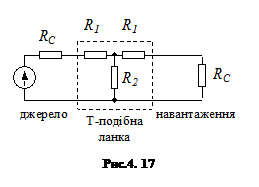 У високочастотних та широкосмугових вимірювальних системах, розрахованих на роботу з конкретними характеристичними опорами застосовують характеристичні атенюатори. Такі атенюатори забезпечують необхідне послаблення лише у тому випадку, коли застосовуються разом з точно визначеними (характеристичними ) опорами навантаження та генератора. Простою реалізацією такого характеристичного атенюатора є каскадне сполучення декількох симетричних Т-подібних ланок. На рис.4.17 показана одна ланка такого атенюатора.