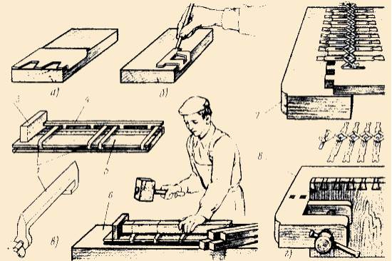 Щоб підігнати одну дошку до другої, необхідно дошку з обробленою кромкою прикласти до кромки дошки, на яку будуть наносити риски; між дошками залишають зазор, в який встановлюють відокреслювальний інструмент. Рухаючи його вздовж зазору, загостреним цвяхом наносять риску (рис. 6, д).