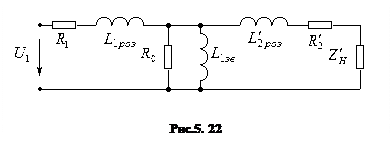 На основі рівняння (5.77) синтезуємо коло, схема якого показана на рис.5.22. Схема трансформатора показана на рис.5.22 називається еквівалентною схемою реального трансформатора з приведеними параметрами вторинної обмотки до первинної. В цій схемі відсутній магнітний зв’язок між обмотками.