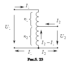 У тому разі, коли необов’язково гальванічно відділяти первинну й вторинну обмотки, а необхідність трансформації напруги у незначних межах залишається, використовують трансформатори з однією обмоткою, так звані автотрансформатори. Автотрансформатори використовують як для пониження напруги так і для її підвищення. Схема понижуючого автотрансформатора показана на рис.5.23. Автотрансформатор являє собою замкнене феромагнітне осердя, на яке навита одна обмотка, в якій частково поєднанні первинна та вторинна обмотки (вивід вторинної обмотки робиться від деякої точки А). Розглянемо, на початку, принцип дії такого автотрансформатора в режимі холостого ходу. До первинної обмотки з кількістю витків