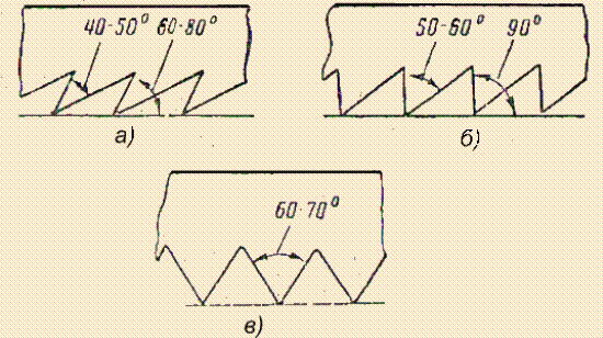 Рис. 9. Кути зубів пил: а) для повздовжнього пиляння б) для мішаного пиляння; в) для поперечного пиляння