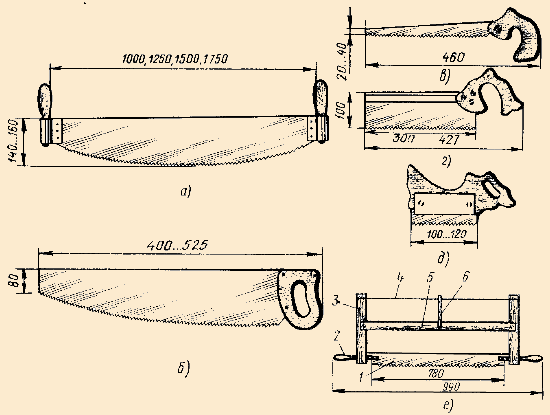 Рис. 10. Пили: а - дворучна поперечна, б - ножівка широка поперечна, в - ножівка вузька, г - ножівка з обушком, д - наградка, е - лучкова пила; 1- полотно, 2 - ручки, 3 - стійки або бокові планки, 4- тятива, 5 - серединник, 6 - закрутка