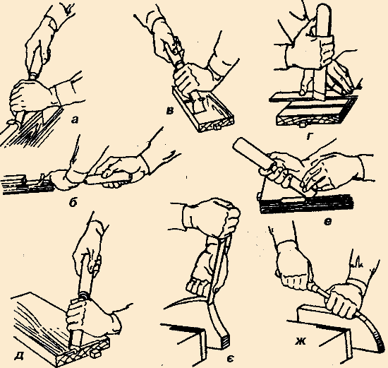 Рис.16. Прийоми роботи стамесками: а - підстругання; б - підчищення шипа; в - зачищування гнізда під завіси; г - різання по лінійці; д - зняття фаски на торці; е - зняття фаски на повздовжньому ребрі; є - прийоми зачищення увігнутого торця; ж - прийоми зачищування опуклого торця.