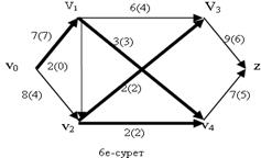 өрнегі орындалады. Ендеше теореманың салдары бойынша φz ең үлкен ағын болып табылады. Мысал. 2-суретте өрнектелген транспорт желісінің ең үлкен ағыны анықтау керек.Әр доғада жазылған сандар осы доғаның өткізу қабілетін білдіреді. Жолдың басы v0 төбесін соңы z-пен қосатын барлық жолды тізіп шығайық: m1=(v0, v1, v4, z); m2=(v0, v1, v2, v4, z); m3=(v0, v2, v3, z); m4=(v0, v1, v3, z); m5=(v0, v1, v2, v3, z); m6=(v0, v2, v4, z). Желідегі алғашқы ағынды 0 деп алып, оны әр жолдың ең болмаса қаныққан бір доғасы болғанға дейін біртіндеп көбейтеміз. Ол үшін әр жолдан доғалардың өткізу қабілеті мен осы доғалардағы ағынның ең кіші айырымын анықтаймыз және бүкіл жолдағы ағынды осы шамаға арттырамыз. Бұл процесс 6а, 6b, 6с, 6d суреттерде көрсетілген,доғаларда әрқайсысының өткізу қабілетімен бірге жақша ішінде осы доғаның ағыны көрсетілген. 6d суреттегі құрылған ағын толық және ол jz = 9 (6а –6d) суреттерде қаныққан доғалар жуан сызықтармен бейнеленіп тұр).