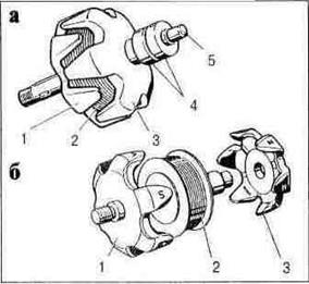 а - ротор в сборе, б - полюсная система в разобранном виде, 1 и 3 - полюсные половины; 2 - обмотка возбуждения; 4 - контактные кольца: 5 – вал.