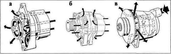 а - генераторы традиционной конструкции; б - генераторы компактной конструкции; в - генераторы для повышенной температуры подкапотного пространства. Стрелками указано направление движения охлаждающего воздуха.