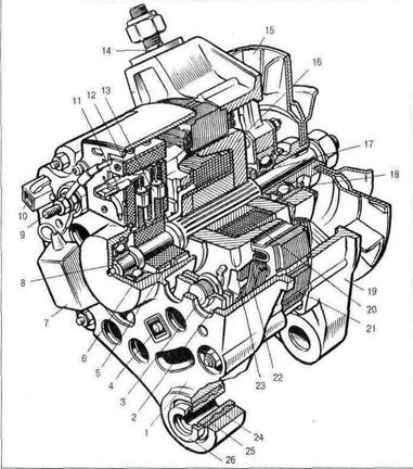 1 - крышка со стороны контактных колец; 2 - выпрямительный блок; 3 - вентиль (диод) выпрямительного блока; 4 - винт крепления выпрямительного блока; 5 - контактное кольцо; 6 - задний шарикоподшипник; 7 – конденсатор; 8 - вал ротора; 9 - вывод «30» генератора; 10 - вывод «61» генератора; 11 - вывод регулятора напряжения; 12 - регулятор напряжения; 13 - щетка; 14 - шпилька крепления генератора к натяжной планке; 15 - шкив с вентилятором; 16 - полюсной наконечник ротора; 17 - дистанционная втулка; 18 - передний шарикоподшипник; 19 - крышка со стороны привода; 20 - обмотка ротора; 21 – статор; 22 - обмотка статора; 23 - полюсный наконечник ротора; 24 - буферная втулка; 25 – втулка; 26 - подвижная втулка.