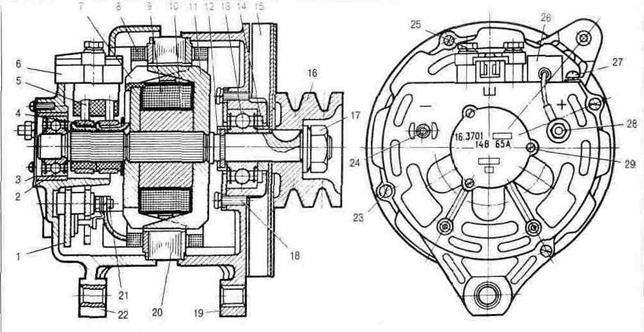 1 - выпрямительный блок; 2, 13 - подшипники; 3 - крышка подшипника; 4 – кольца; 5 – щетки; 6 – щеткодержатель; 7,11 - клювообразные полюсные половины; 8 - обмотка статора; 9 - обмотка возбуждения; 10 - втулки ротора; 12 - стопорное кольцо; 14 - упорная втулка; 15 - вентилятор; 16 – шкив; 17 - гайка крепления шкива; 18 - винт крепления фланца подшипника; 19 - передняя крышка; 20 - сердечник статора; 21 - гайка болта соединения выходов фаз статора с выпрямителем; 22 - задняя крышка; 23 - стяжные винты; 24 - вывод «–»; 25 - болт крепления щеткодержателя; 26 – конденсатор; 27 - винт крепления конденсатора; 28 - вывод «+»; 29 - винт крепления крышки подшипника.
